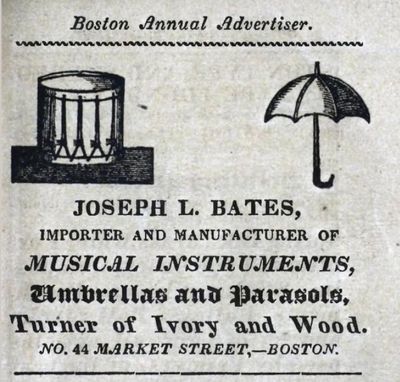 Joseph L. Bates was born somewhere between 1806-1807 in Massachusetts. He first appears in the Boston City Directory in 1828. To the right, you can see his advertisement from that year stating that he is an "IMPORTER AND MANUFACTURER OF/ MUSICAL INSTRUMENTS, Umbrellas and Parasols, Turner of Ivory and Wood/ NO. 44 MARKET STEET, - BOSTON."