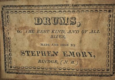 It was certainly not a far jump to then construct drums as well. Emory made an "enormous drum, which for many years was so accurately and soundly beaten by Elbridge Wood on training and muster days..." Of the many elected positions Emory held throughout his life in Rindge, captain of the militia was the most notable as he is often referred to as "Captain Stephen Emory" in the town histories. He lived to the ripe old age of 95 and died on January 13, 1874.