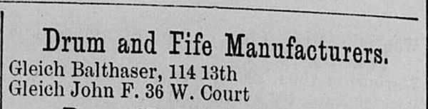 John F. Gleich was born in Germany around 1812. His immigration to the United States is not known, but he is listed in the Cincinnati Business directory as early as 1849 as a "turner" on 9th and Walnut. In 1862, he moved his business to 36 West Court Street and remained there throughout the 1870s.