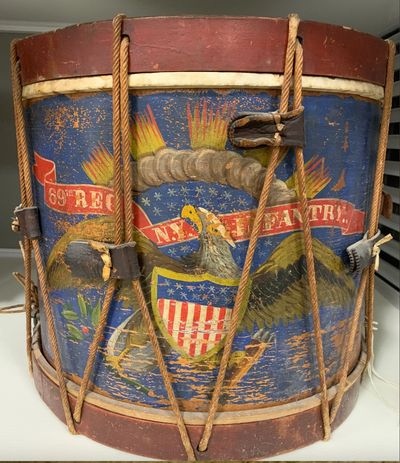 Another Hall and Son labeled drum carried by the 69th New York Volunteers, part of the famous Irish Brigade. These drums have a specific eagle motif with gray swirling clouds. The eagle’s head is also somewhat round like a helmet. The blue field is also an interesting deeper blue than on many other contract drums.