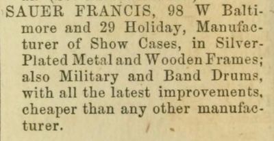 In any case, Frances Sauer does appear in the Baltimore City Directory in 1860 as a cabinet maker. Clearly his ability in cabinetry provided the skill set for drum making. To the right you will see the list of items offered by Sauer including not only military and band drums, but show cases and wooden frames.