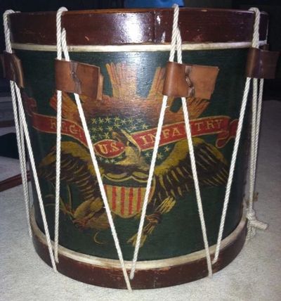 On July 26, 1864, an interesting order was placed for 100 artillery drums, complete, ¾ size at $6.75 each, and 200 artillery drums, complete, full size, at $7.50. This drum has a red painted field as opposed to the blue field, utilized for infantry, and carries on the ribbon "REG: U.S. ARTILLERY." The example to the left is an example of a "full size" artillery drum.