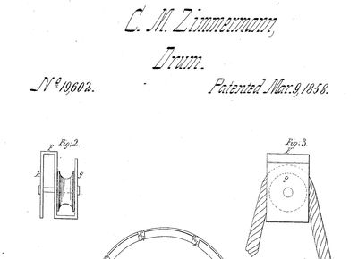 In 1858, Zimmermann received a patent for "improvements in securing the ropes to the sides of the hoops forming the ends of the drums and consists in a ready mode of connecting and disconnecting said ropes, also in lessening the friction and wear of said ropes by a series of pulley's arranged on the sides of the hoops." The image to the right is from the U.S. Patent website, uspto.gov. Zimmermann goes on to describe how his invention is used and specifically states this to be used with a "metal shell."